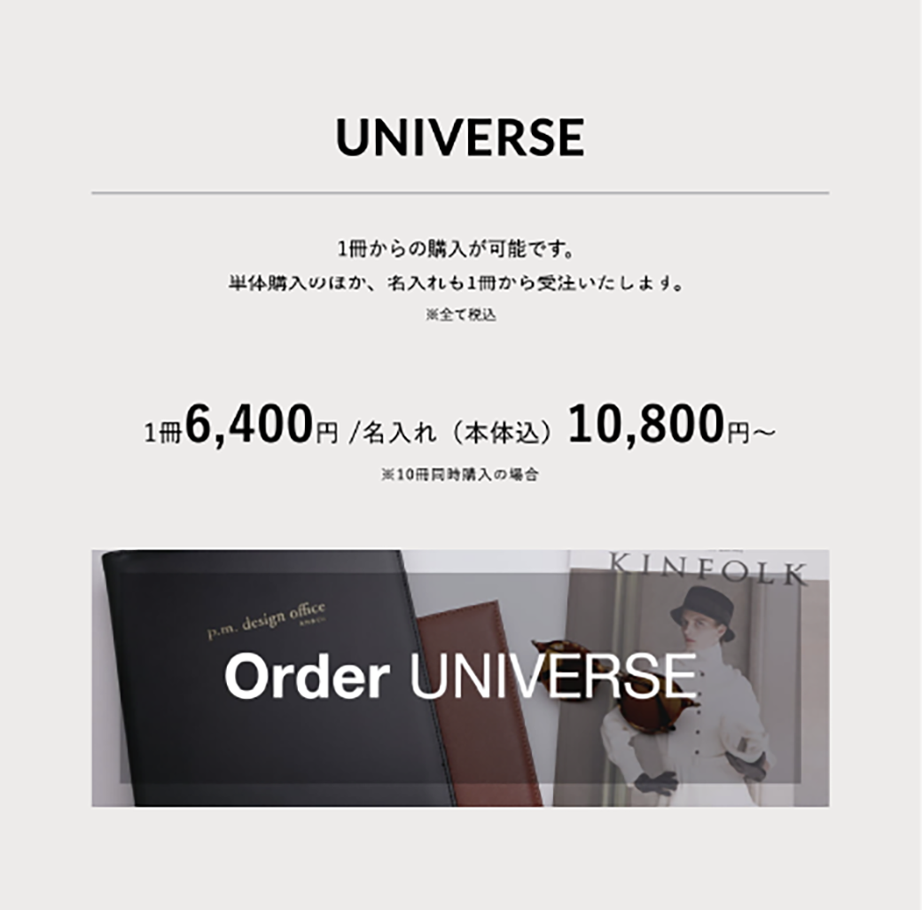 「UNIVERSE」は持ち運びも軽い、中身が入れ替え可能なリングタイプ。一冊から本体のみの購入はもちろん、自分のオリジナルデザインも自動で簡単にオーダーができます。