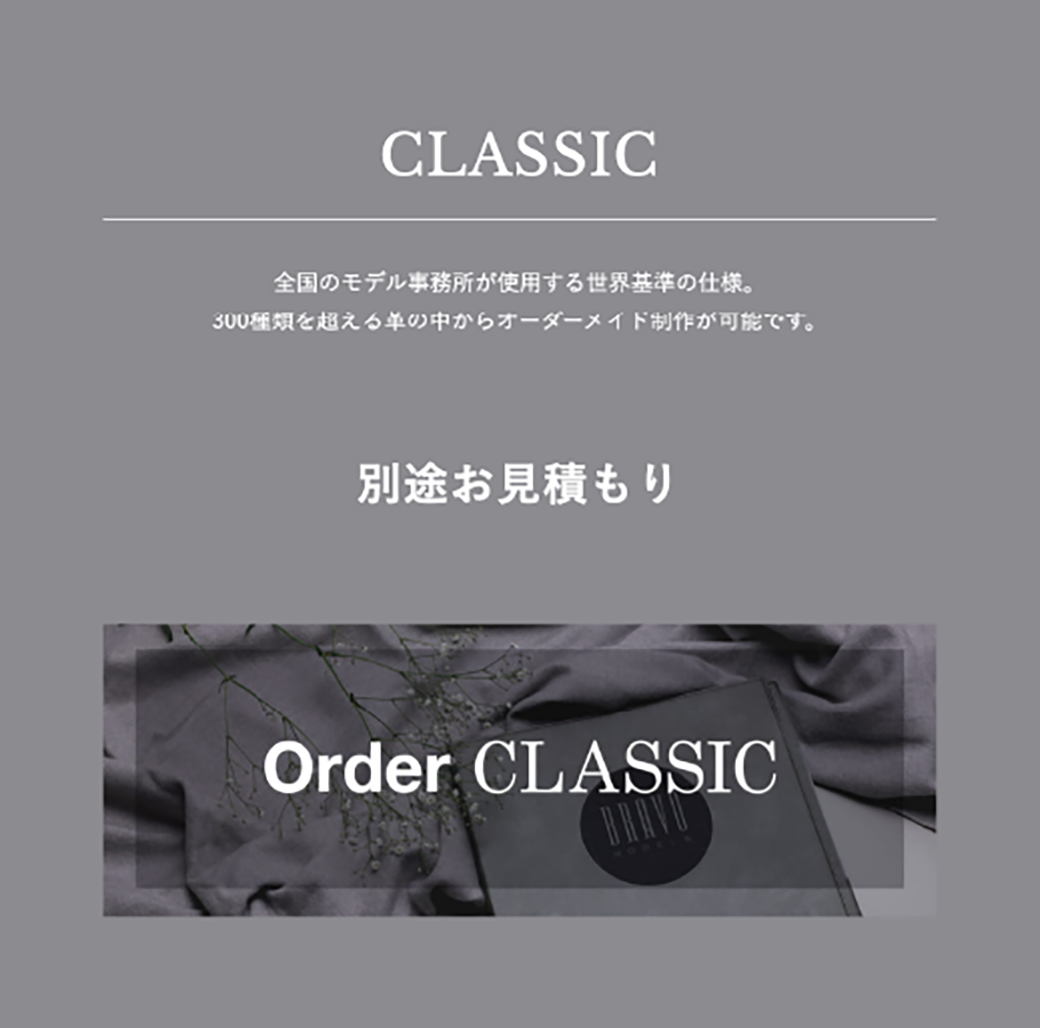 弊社設立当初より、大手モデル事務所はじめ全国のモデル事務所からご依頼を受け、それぞれの事務所にあったご提案を叶えてきました。CLASSICシリーズでは本場海外で使用されるBOOKと同じ素材を仕入れ、世界に通用するグローバル基準にこだわっています。