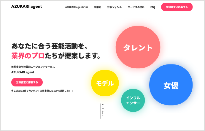 これから業界を目指す方向け、現在活躍中の現役モデル・タレント向けなど、提供するサービスレベルもさまざまです。